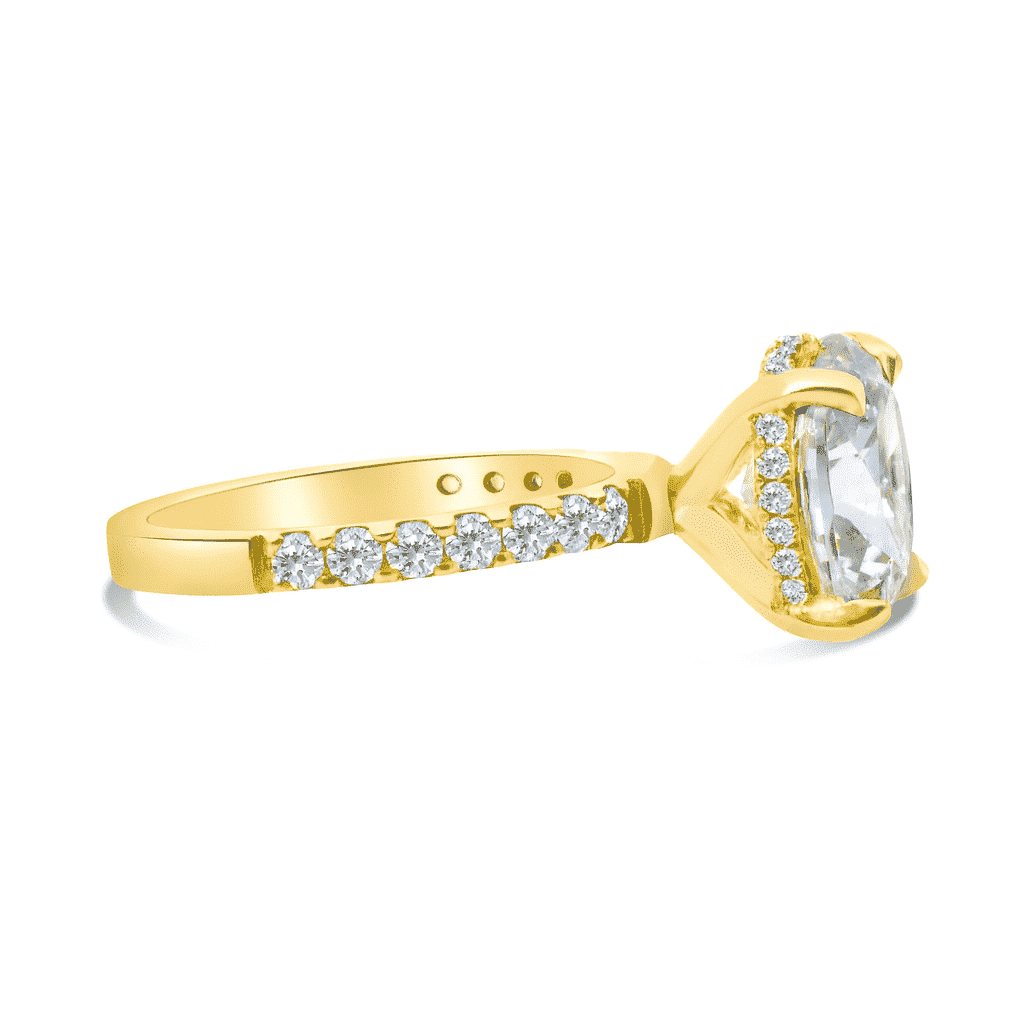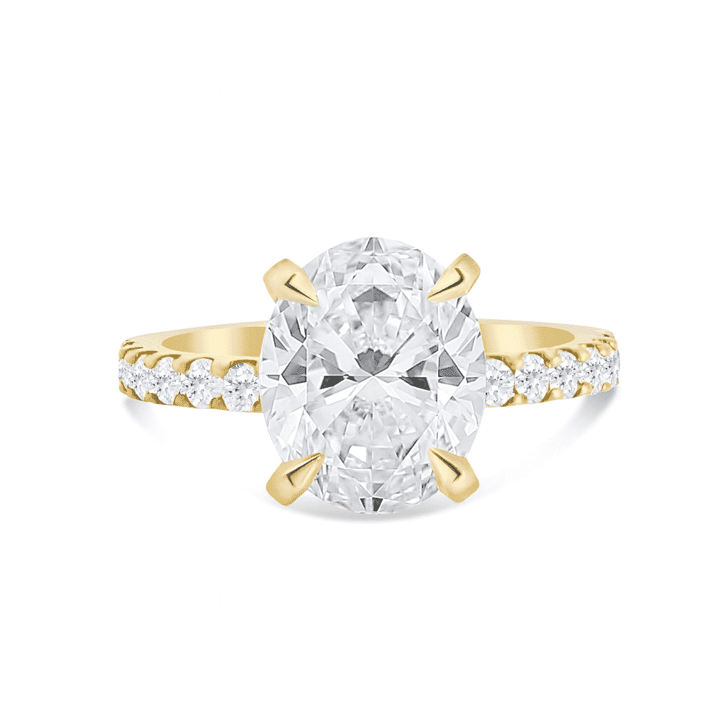 14kt Yellow Gold “Classic Accented” Engagement Ring, the Center Diamond is a 3.01 carat IGI certified Lab-Grown Oval-shape Diamond (IGI LG759524283), “Excellent” Cut, D Color & VS1 Clarity.