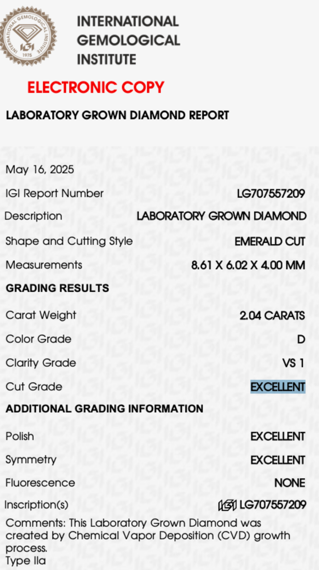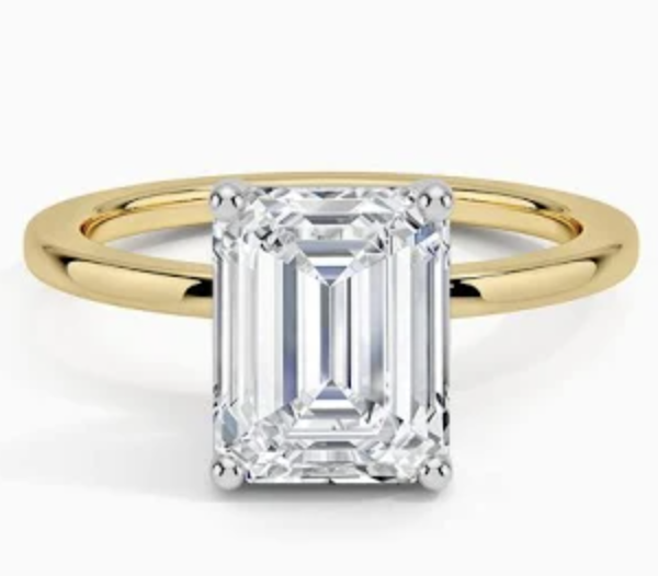 14kt White Gold (basket) and 14kt Yellow Gold (band) Solitaire Engagement Ring, the Center Diamond is a 2.04 carat IGI certified Lab-Grown Emerald-cut Diamond (IGI 707557209), “Excellent” Cut, D Color & VS1 Clarity.