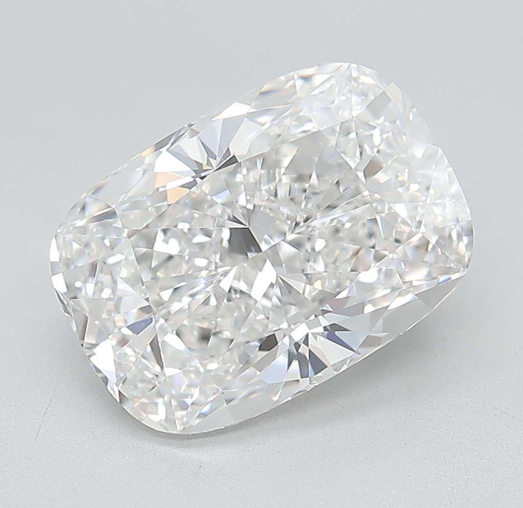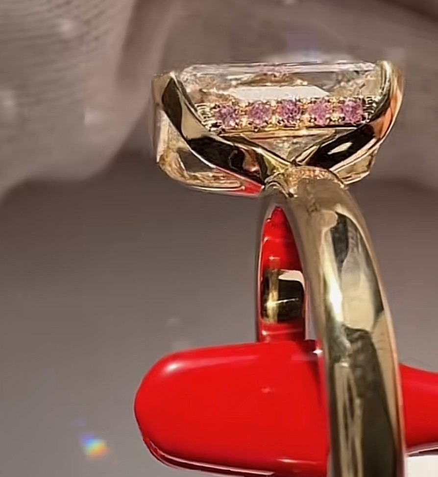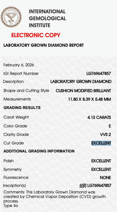 Custom-designed Engagement Ring, the Center Diamond is a 4.13 carat IGI certified Lab-Grown elongated Cushion Diamond, “Excellent” Cut Grade, “E” Color and “VVS2” Clarity.
