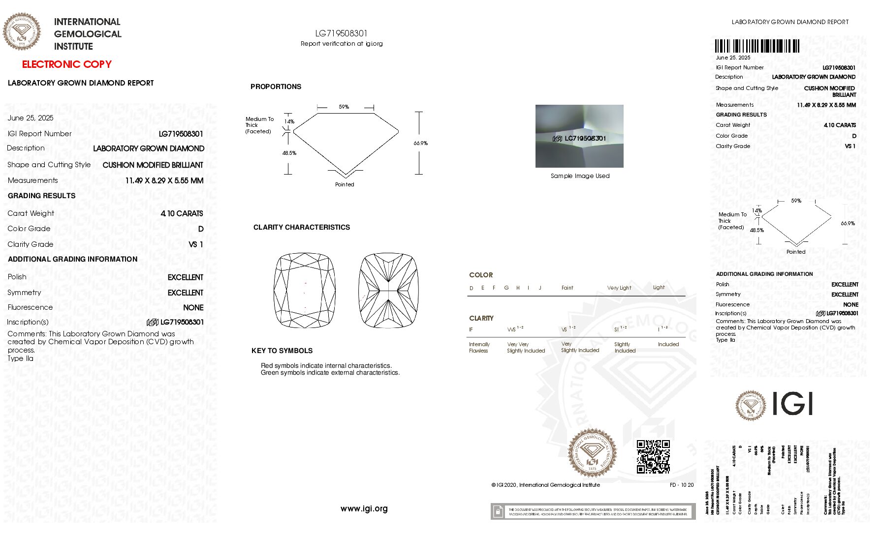 14kt White Gold Engagement Ring, the Center Diamond is a 4.01 carat IGI certified Lab-Grown elongated Cushion Diamond (IGI LG710507943), D Color & VS1 Clarity. High-set, Wedding Ring sits flush underneath.