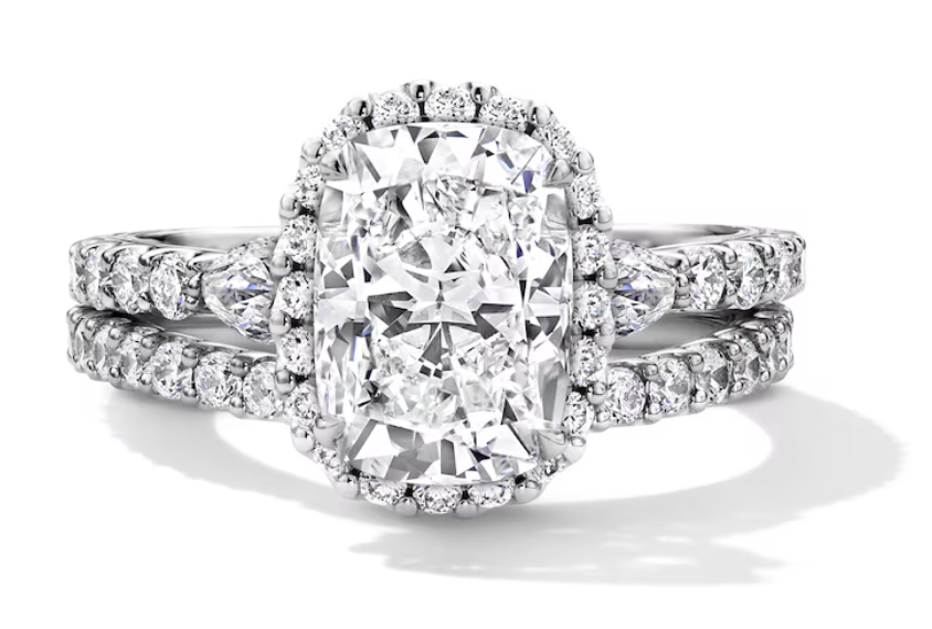The Setting takes 2.00 mm Diamonds going halfway around the band, 5×3 mm Pear-shape Diamonds at the top of the band, and a top halo of 1.30 mm Diamonds, all totaling 1.25 carats additional. Finger size 5.5.