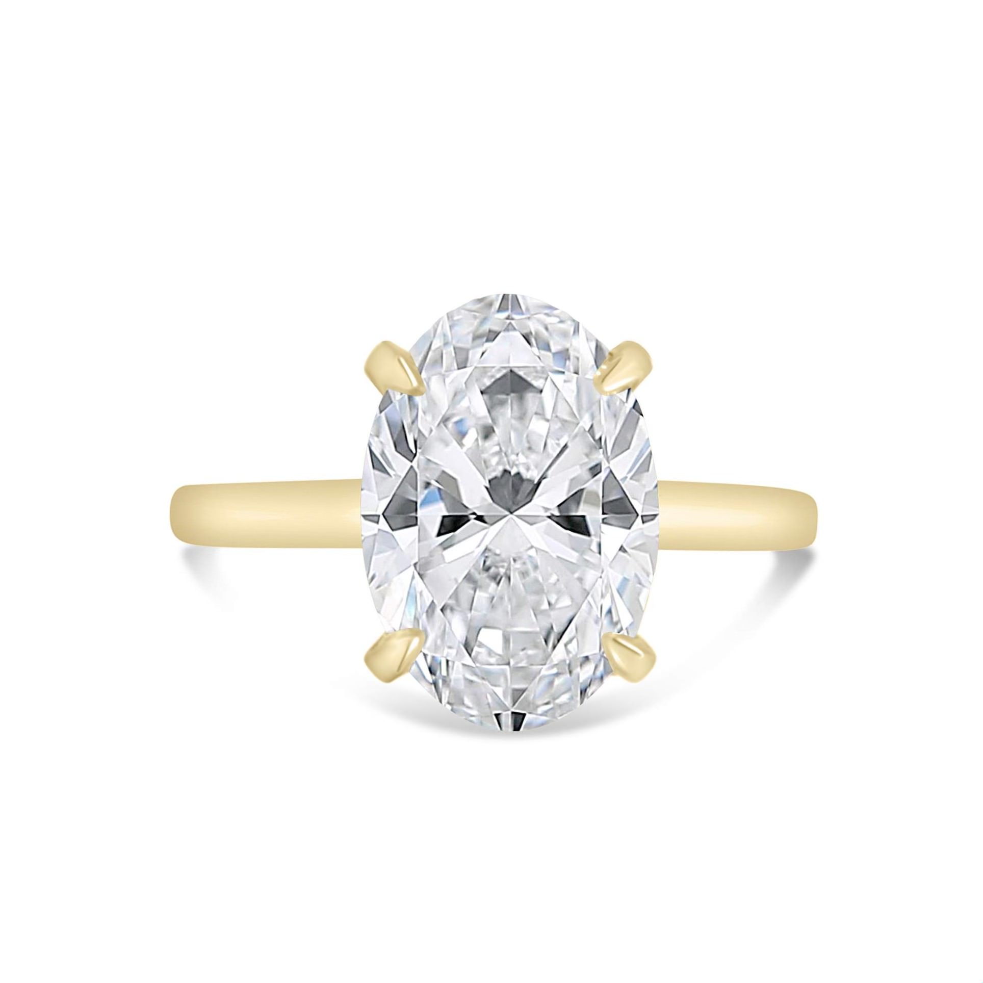 14kt Yellow Gold (shank) and 14kt White Gold (basket) Solitaire Engagement Ring with a hidden halo of 1.10 mm Diamonds, adding 0.20 carats, matching quality to the Center Diamond. The Center Diamond is a 3.54 carat IGI certified Lab-Grown Oval-shape Diamond (IGI LG723551384), “Excellent” Cut, E Color and VVS2 Clarity. 1.40 L/W ratio. Size 6.50.