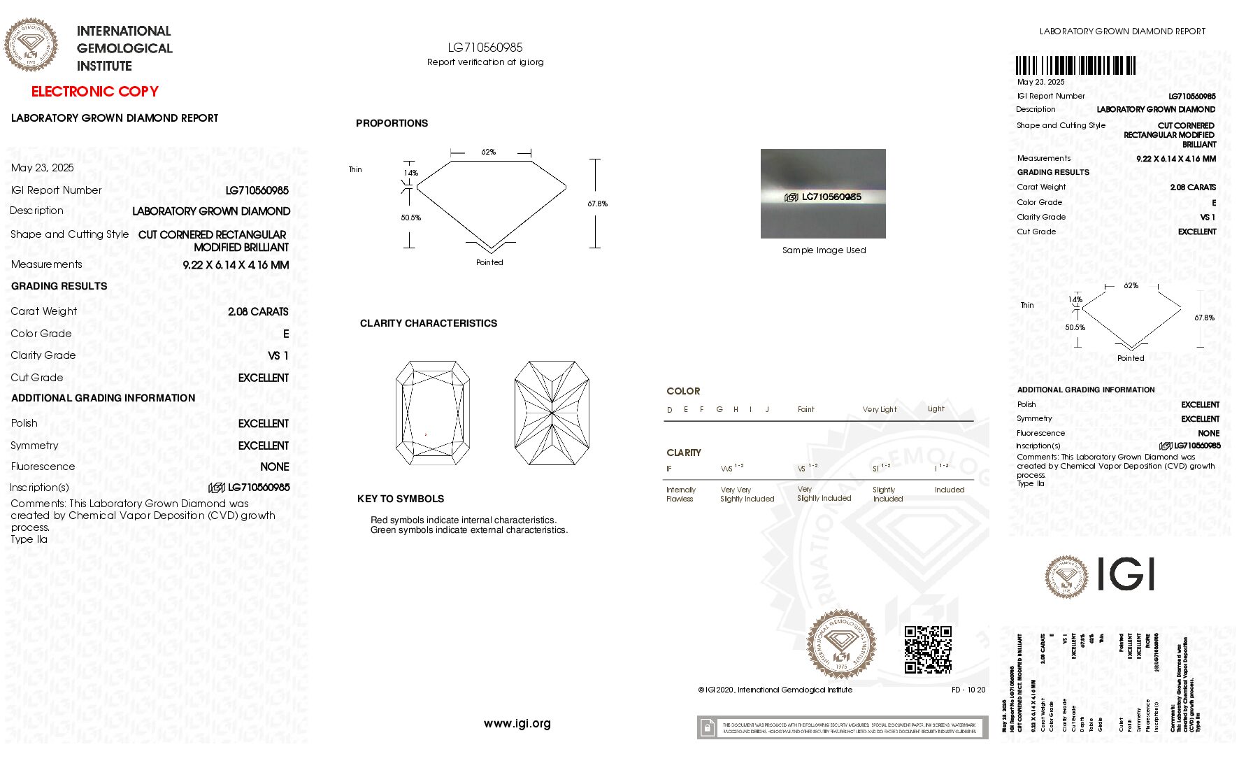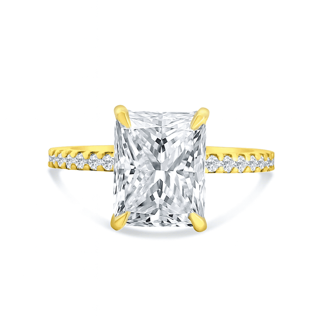 14kt Yellow Gold “Classic Accented” Engagement Ring, the Center Diamond is a 2.08 carat IGI certified Lab-Grown Radiant-cut Diamond (IGI 710560985), “Excellent” Cut, E Color & VS1 Clarity.