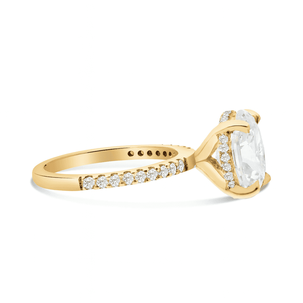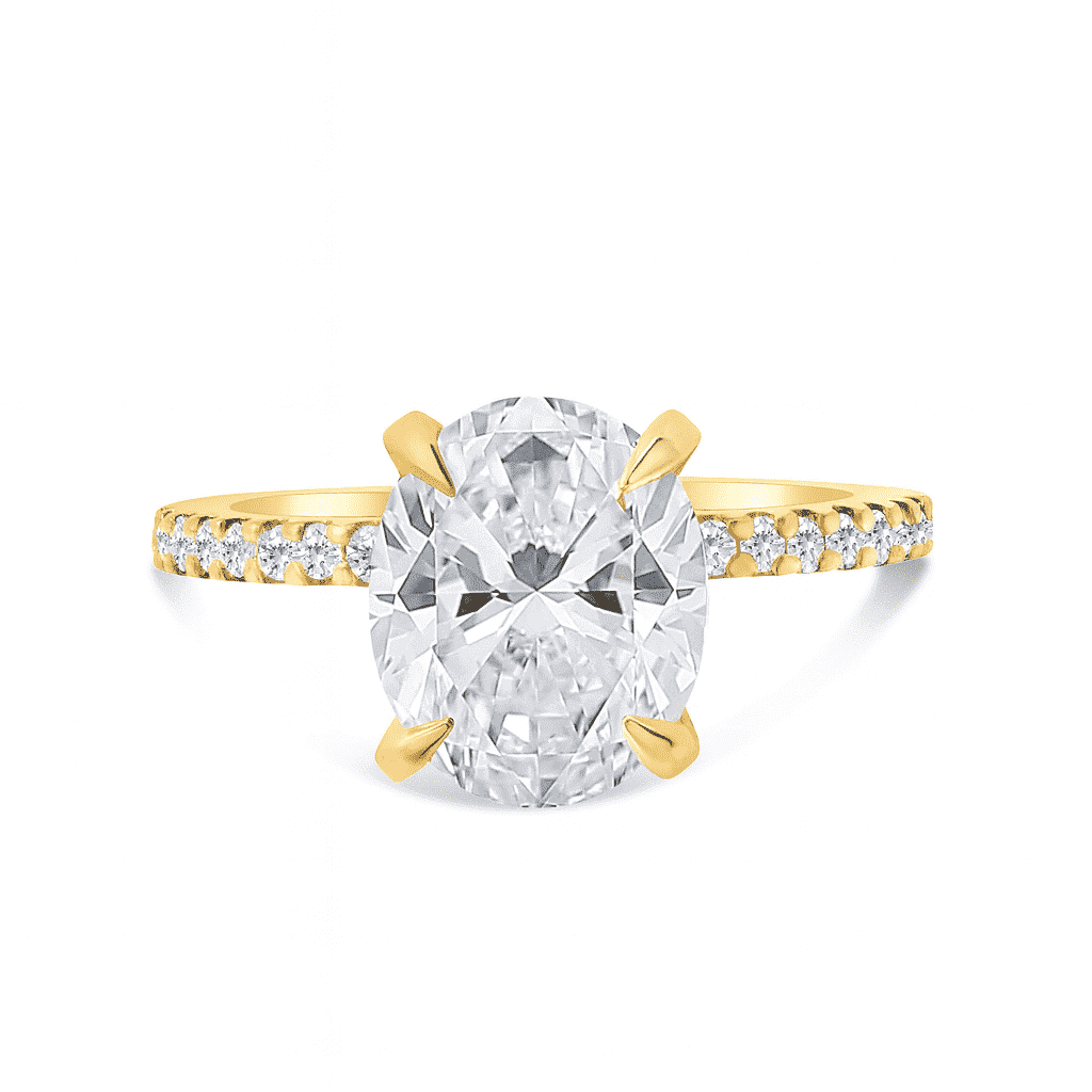 14kt Yellow Gold “Classic Accented” Engagement Ring, the Center Diamond is a 3.00 carat IGI certified Oval-shape Lab Diamond (IGI LG757541875), “EX” Cut, D Color and VS1 Clarity.