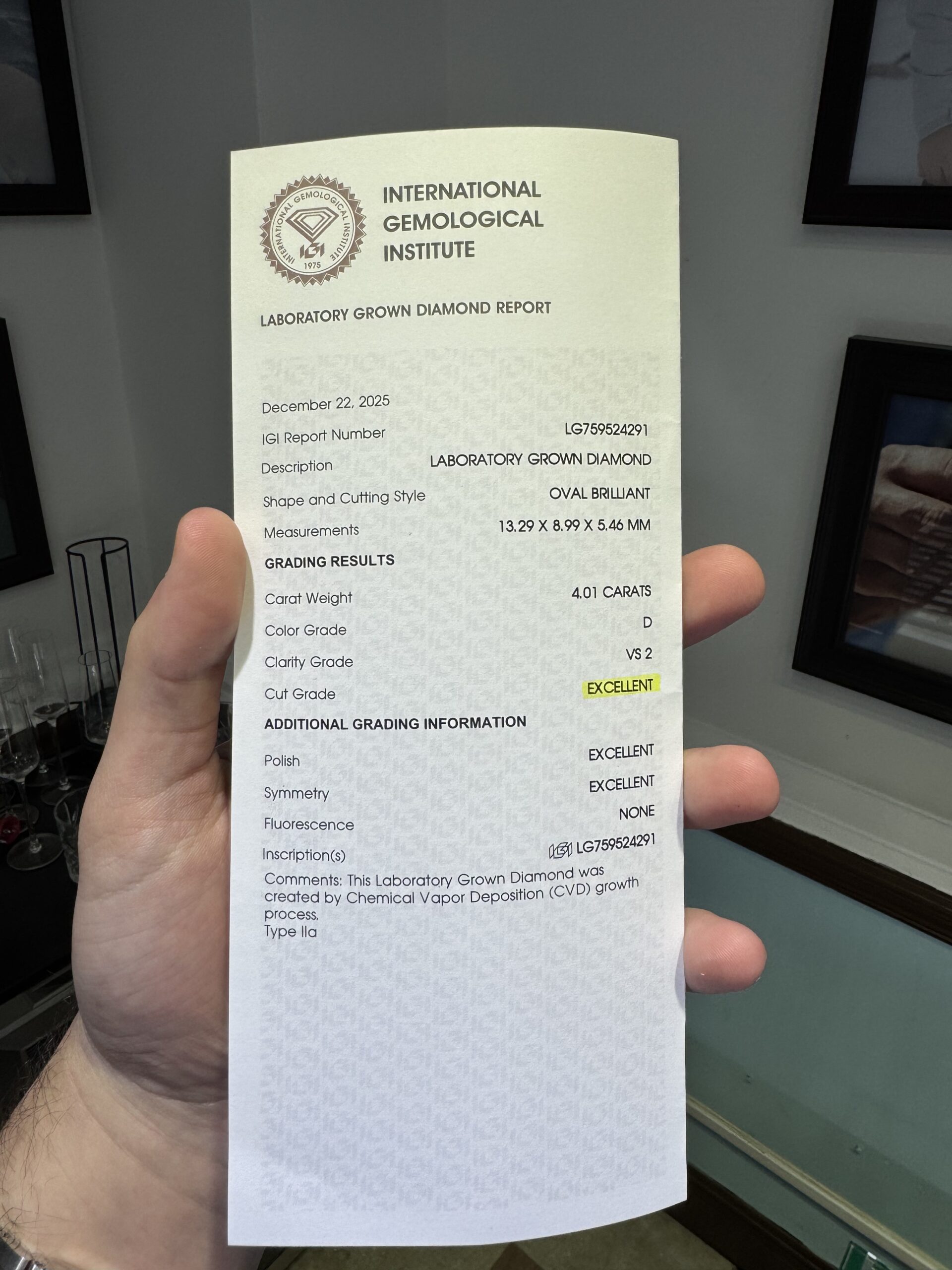 14kt White Gold Engagement Ring, the Center Diamond is a 4.01 carat IGI certified Lab-Grown Oval-shape Diamond (IGI LG759524291), “Excellent” Cut, D Color & VS2 Clarity.
