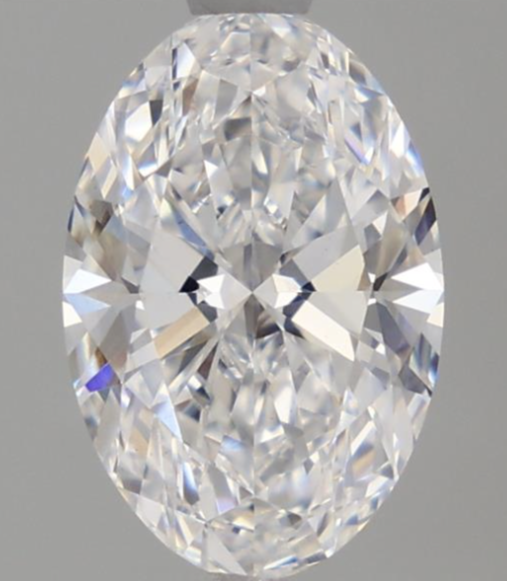 14kt Yellow Gold cathedral-style Engagement Ring, the Center Diamond is a 2.09 carat IGI certified Lab-Grown Oval-shape Diamond (IGI LG733582103), “Excellent” Cut, D Color & VS1 Clarity. The 2 mm wide Setting takes 1.10 mm Diamonds on the hidden halo and the bridge (approx .30 carats additional), all matching quality to the Center Diamond. Finger size 5.