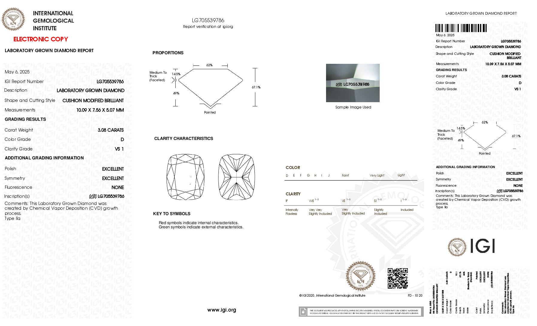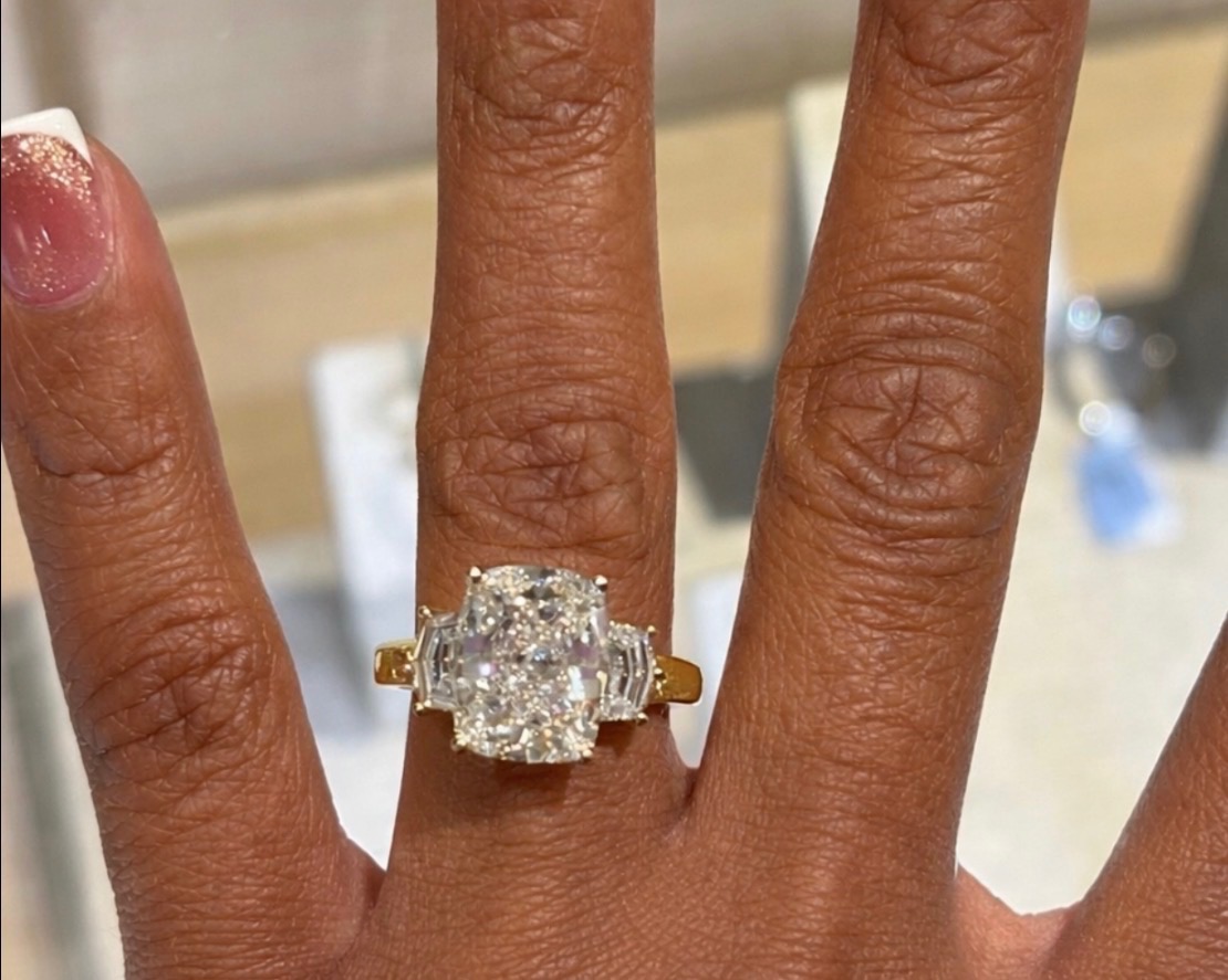 14kt Yellow Gold Engagement Ring, the Center Diamond is a 3.08 carat IGI certified Lab-Grown elongated Cushion-shape Diamond (IGI LG705539786), D Color & VS1 Clarity.
