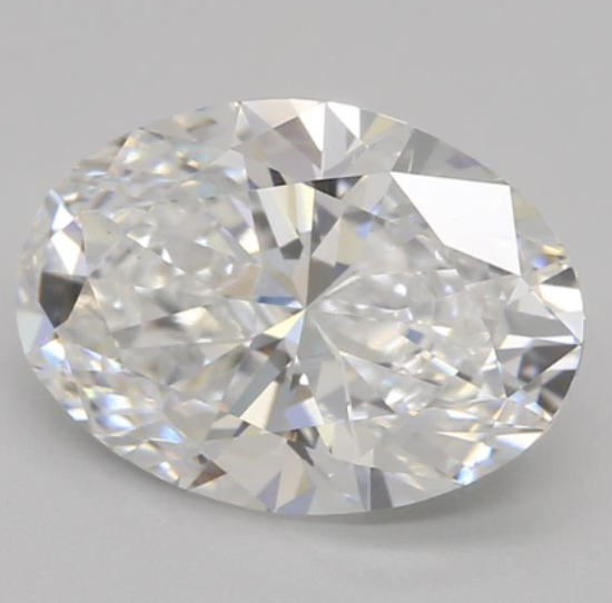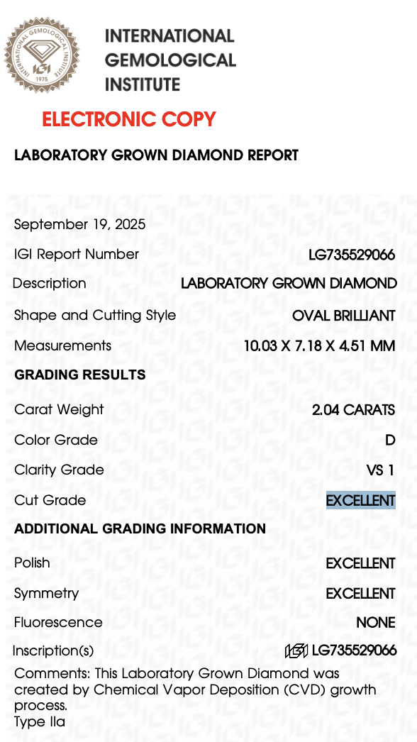 2.04 carat IGI certified Lab-Grown Oval-shape Diamond (IGI #LG723578073), official “Excellent” Cut Grade, perfect D Color and clean VS1 Clarity.