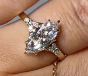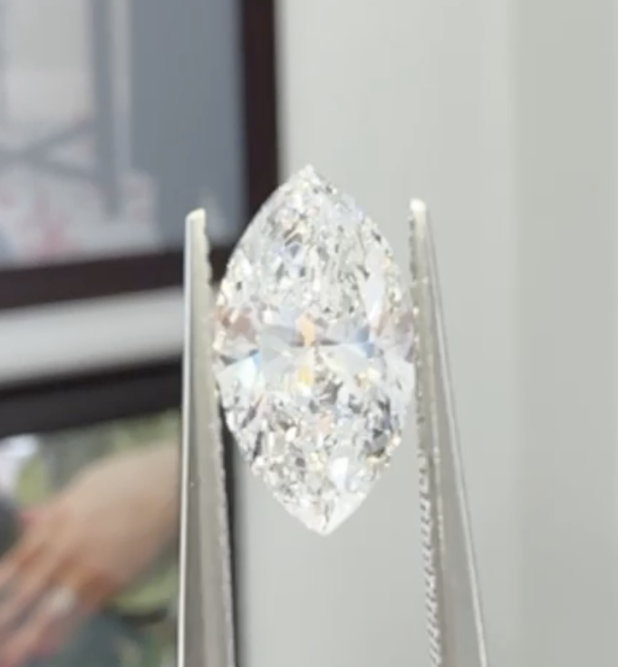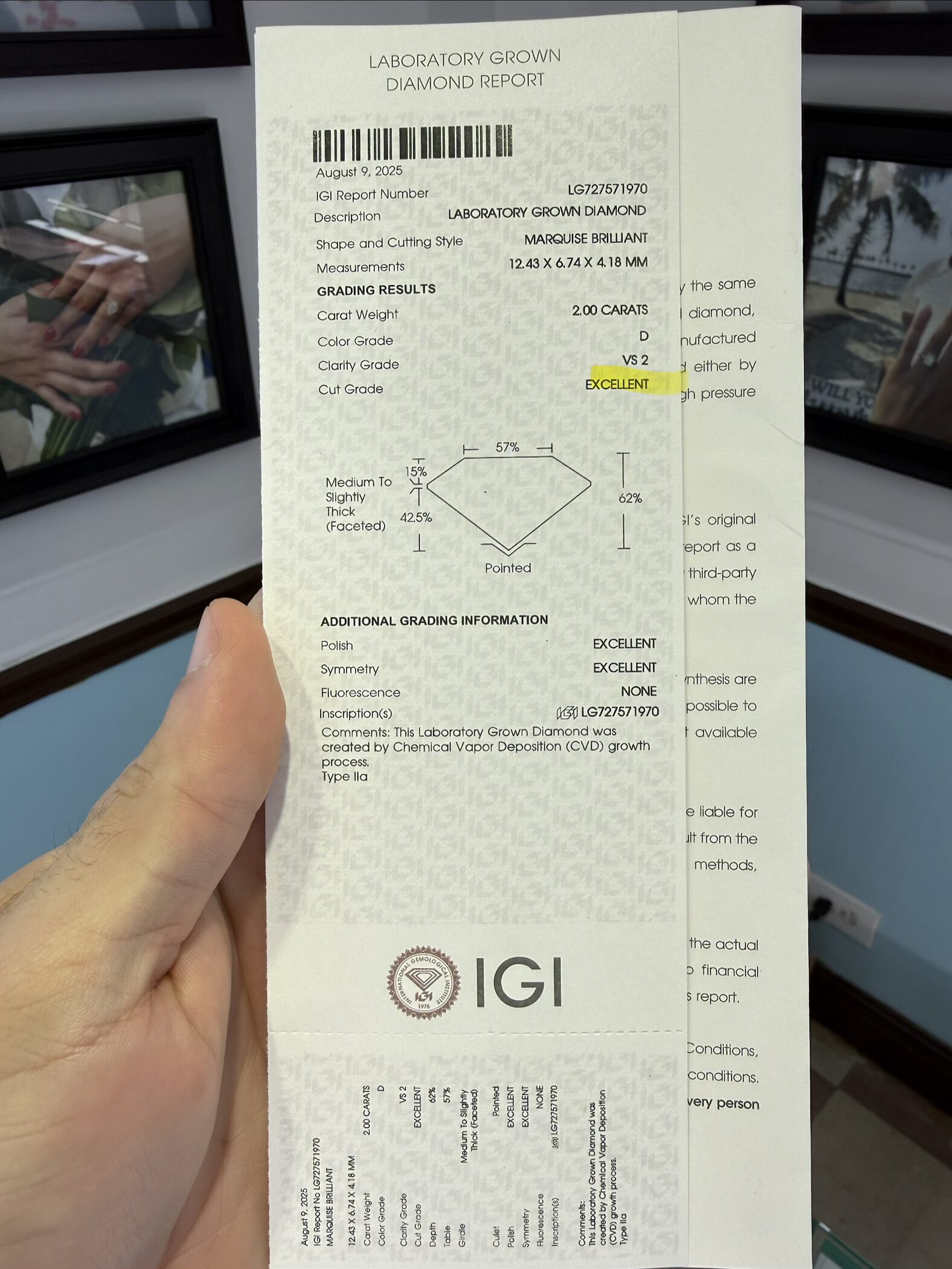 Platinum Engagement Ring, the Center Diamond is a 2.00 carat IGI certified Lab-Grown Marquise-shape Diamond (IGI LG727571970), “Excellent” Cut, D Color & VS2 Clarity.