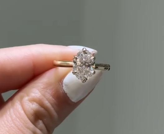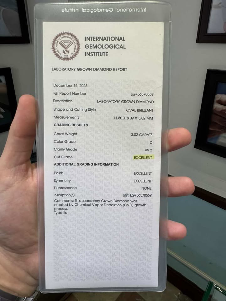 14kt Yellow Gold cathedral-style Engagement Ring, the Center Diamond is a 3.02 carat IGI certified Lab-Grown Oval-shape Diamond (IGI LG756570559), “Excellent” Cut, “D” Color & “VS2” Clarity. 1.45 L/W ratio.