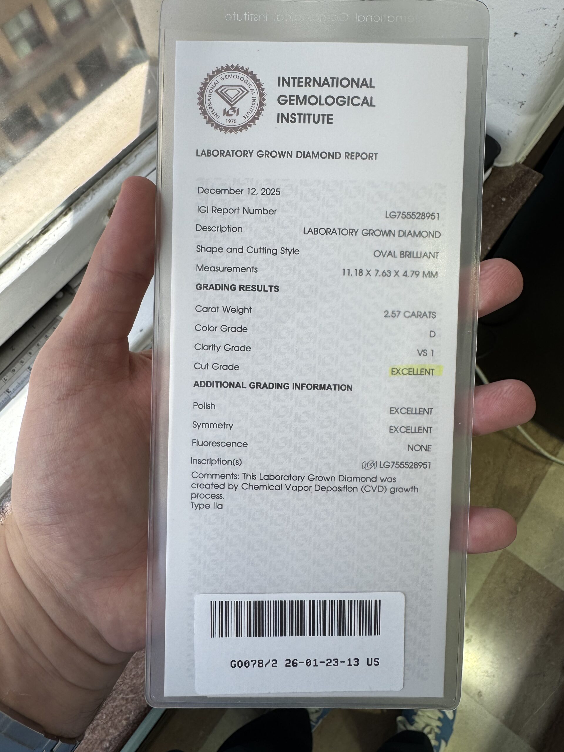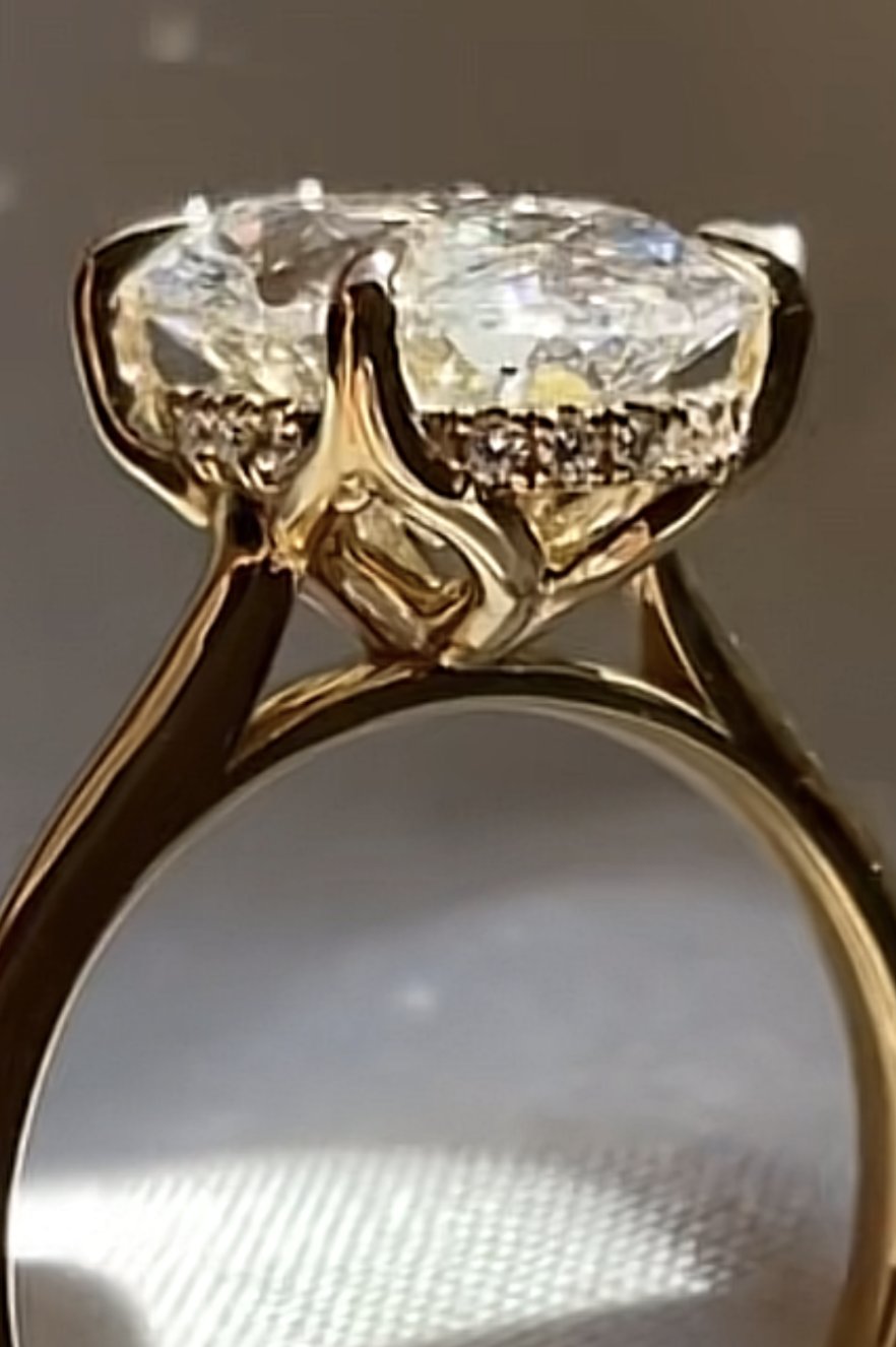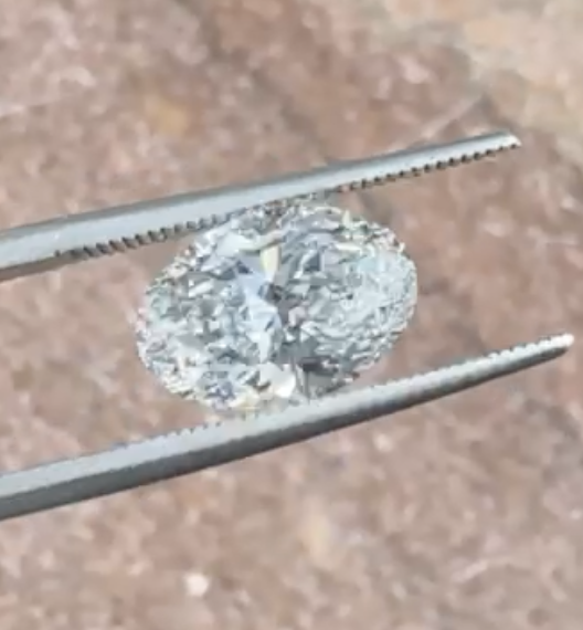 14kt Yellow Gold Engagement Ring, the Center Diamond is a 2.57 carat IGI certified Lab-Grown Oval-shape Diamond (IGI LG755528951), “Excellent” Cut, D Color and VS1 Clarity.