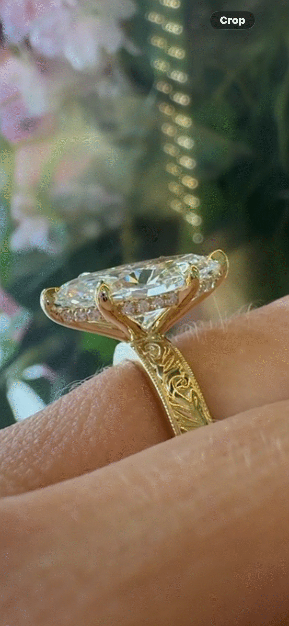 The Setting is a Custom 3.20 mm wide, 14kt Yellow Gold, 3/4 engraved band, and a floating 6-claw-prong basket set with a hidden halo of 1.10 mm Diamonds, totaling 0.20 carats additional,
