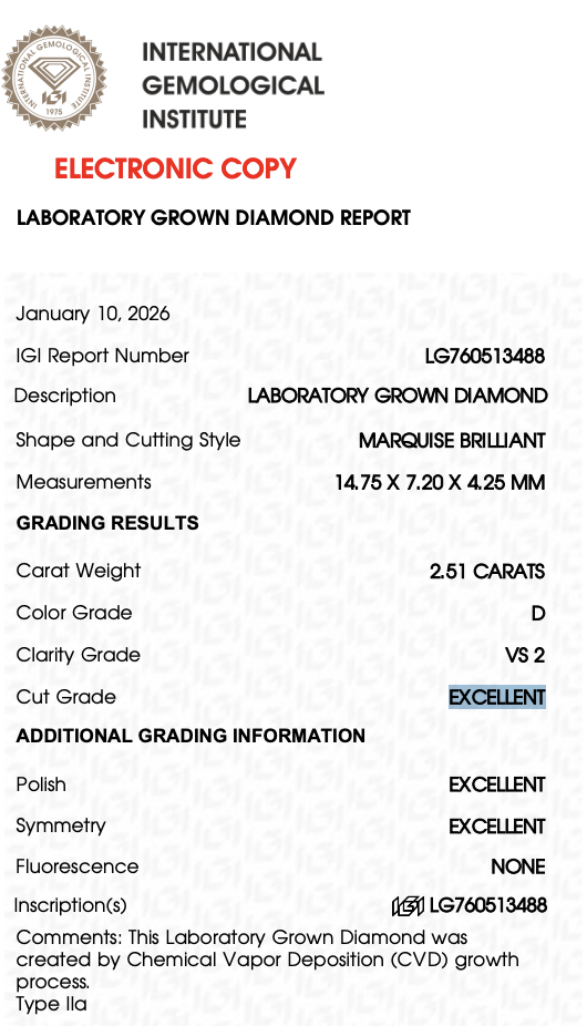 The Center Diamond is a 2.51 carat IGI certified Lab-Grown Marquise-shape Diamond (IGI LG760513488), official “Excellent” Cut Grade, perfect D Color and clean VS2 Clarity.