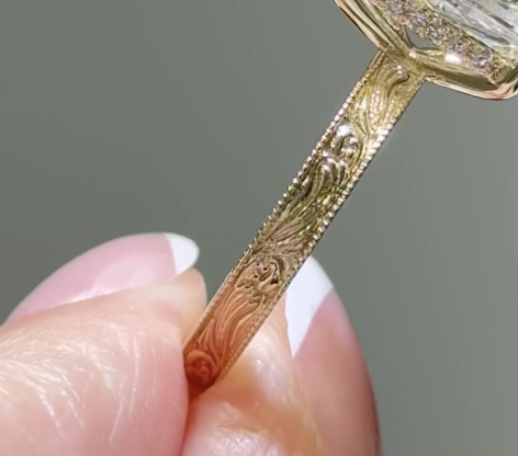 The Setting is a 2.50 mm wide cathedral-style Solitaire band, with vintage engraving going 3/4 around, and a tulip-style basket with a hidden halo of 1.10 mm Round Diamonds (all totaling 0.20 carats additional).