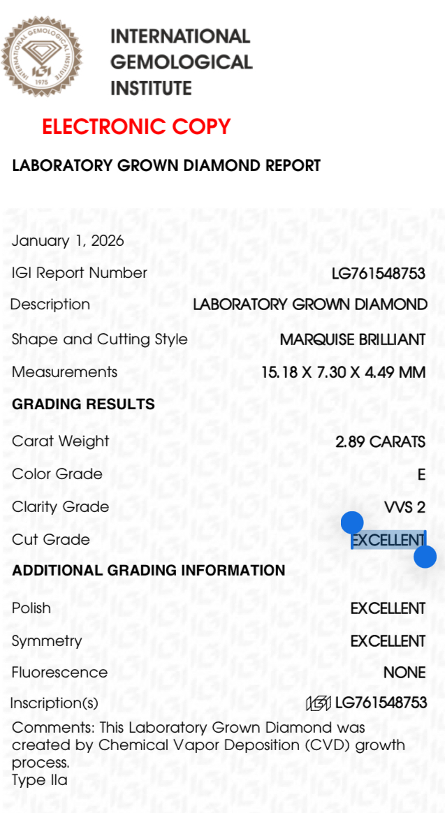The Center Diamond is a 2.89 carat IGI certified Lab-Grown Marquise-shape Diamond (LG761548753), official “Excellent” Cut, “E” Color and “VVS2” Clarity
