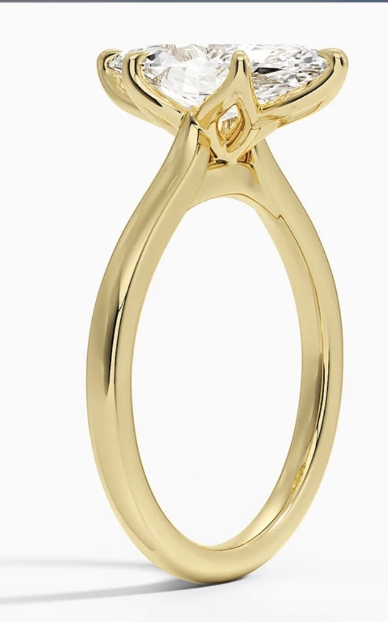 The Setting is a 14kt Yellow Gold Cathedral-style solitaire Engagement Ring, with a 1.80 mm wide, rounded-edge band, and a 6-prong tulip-style basket.